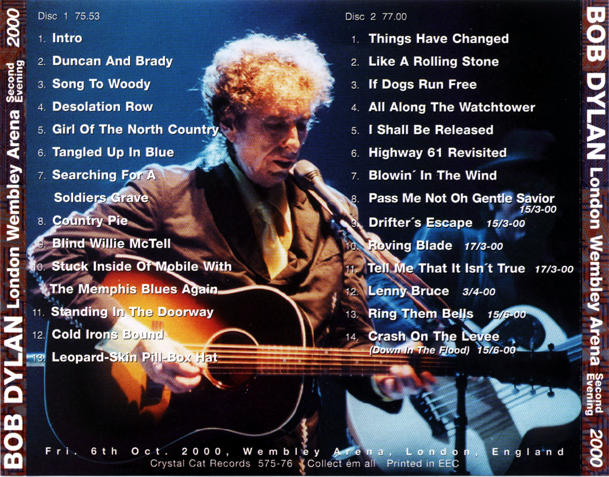 2nd Evening 2000 source: October 6, 2000 Tracks: Disc one Intro Duncan And Brady (a) Song To Woody (a) Desolation Row (a) Girl Of The North Country (a) Tangled Up In Blue (a) Searching For A Soldier's Grave (a1) Country Pie Blind Willie McTell Stuck Inside Of Mobile Standing In The Doorway Cold Irons Bound Leopard-Skin Pill-Box Hat Disc two (encore) Things Have Changed Like A Rolling Stone If Dogs Run Free (a2) All Along The Watchtower I Shall Be Released (a) Highway 61 Revisited Blowin' In The Wind (a) Bonus Tracks: Pass Me Not, O Gentle Savior*(a) (1) Drifter's Escape (1) Roving Blade (a) (2) Tell Me That It Isn't True (2) Lenny Bruce (3) Ring Them Bells (a) (4) Down In The Flood (Crash On The Levee) (4) Review: Crystal Cat created a wonderful series of issues known as the 2000 series to commemorate tour Y2K. The audience recordings are as good as it gets. The package aesthetics are very nice. All contain a 6 page full color booklet. All CDs have the same generic silk screen print, but with wide variations of color backgrounds. The cover features a ticket for the event. This series of 15 double CDs is extremely limited, with only 500 each glass mastered copies. Bob Links Concert Review © 2001 Craig Pinkerton Bobsboots.com |